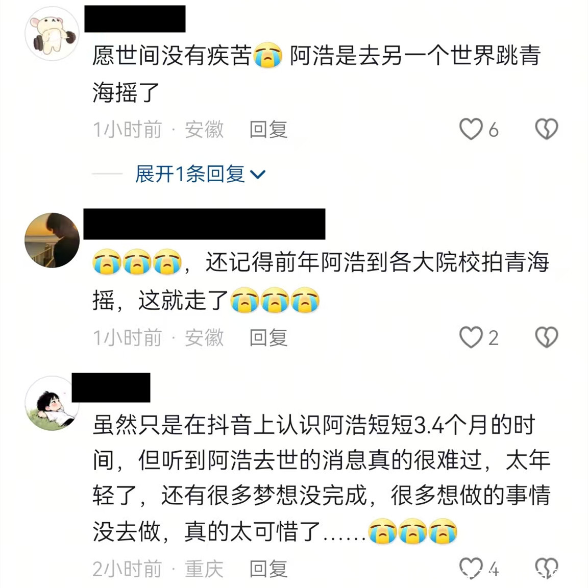 阿浩去世的消息被公布后,目前他账号的评论区已经沦陷,网友纷纷发文悼念。
